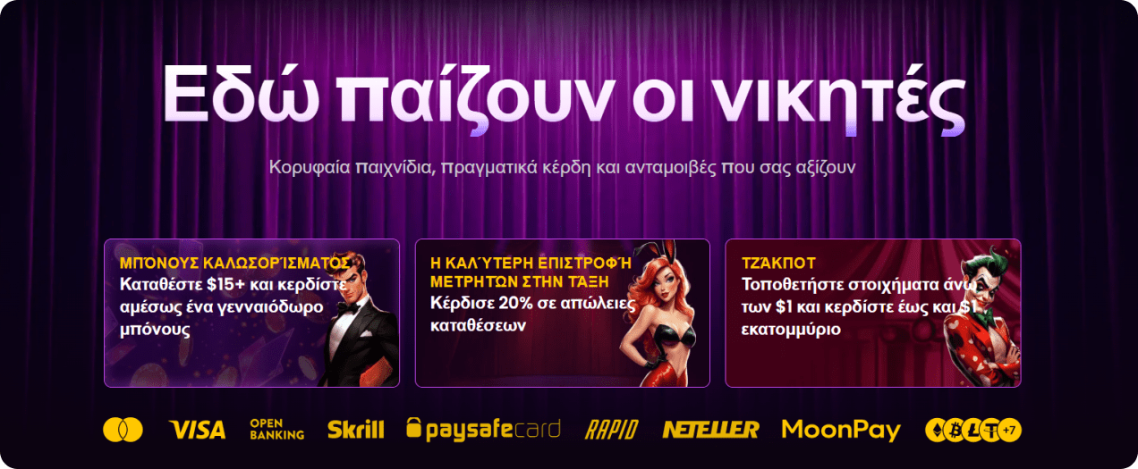 Το καζίνο δεν επιβάλλει επιπλέον χρεώσεις. Πιθανές μικρές χρεώσεις μπορεί να προκύψουν από τον πάροχο πληρωμών (τράπεζα/crypto wallet).